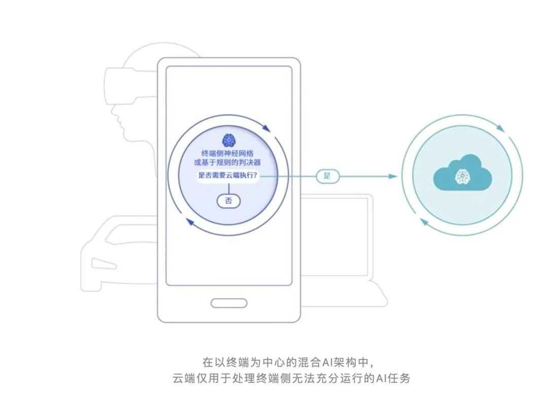 高通在《混合AI是AI的未来》白皮书中表示,云端和边缘终端(如智能手机、汽车、个人电脑和物联网终端)协同工作,能够实现更强大、更高效且更普及的AI应用。高通畅想的未来是,在以终端为中心的混合AI架构中,云端仅用于处理终端侧无法充分运行的AI任务。