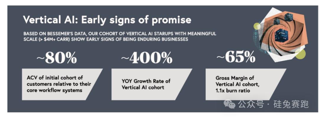 因此Bessemer也判断,未来两到三年内将至少出现五家年度经常性收入(ARR)超过1亿美元的垂直AI公司,未来三年内将出现首家垂直AI软件公司IPO。